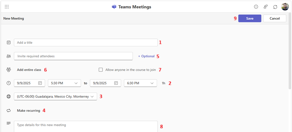 You need to add a title for the meeting (1), as well as chose dates and times (2). Remember to set up the proper time zone (Teams will show the time to everyone in their own time zone) (3). If you plan to have meetings regularly (e.g. every day for a week), you can make one recurring meeting instead of multiple separate meetings (4).