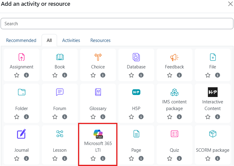 Click on the “All” tab at the top of the Activity Chooser and then “Microsoft 365 LTI” button.