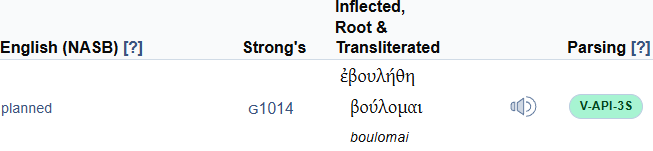 First column shows the word in the English translation. The second column shows you the Strong’s number for the original word (the number is a link and if you click it, you’ll go to the Blue Letter Bible Lexicon – see more in Step 3). The third column shows the original word in the inflected form of the word, the root of the word, and the transliteration of the root. The root is the basic form of the word (here: “plan”), and the inflected form is the form actually used in the text (here: “planned”.) The last column shows you the grammatical explanation of the word, as it appears in the text. You can hover on the letters to show the explanation. Here, V-API-3S stands for: Verb – Aorist Passive Indicative – 3rd Person Singular.