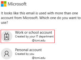 Note that you might get asked about the type of account you’re using. You need to choose “Created by your IT department”. The other option will not work with @tcmi.edu accounts.