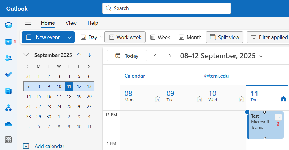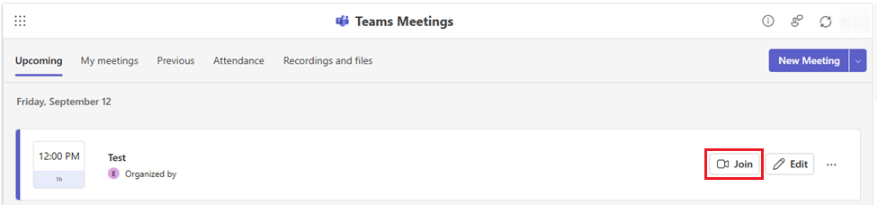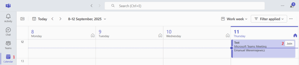 To access a meeting from Teams, go to your Calendar (1) and click on the “join” button on the meeting’s card (2). If you do this on the day of the meeting, the calendar will automatically open on the proper day.
