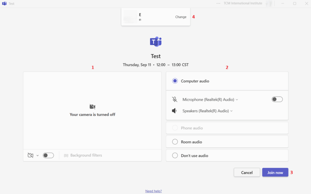 Important! You will be able to join only using your @tcmi.edu account. If you are logged with a different account, click “Change” (4).