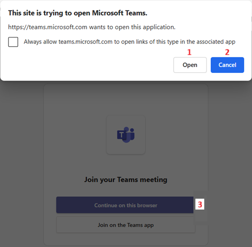 If Microsoft Teams is installed on your device, your browser will warn you that you are trying to open the application. You can either allow it (1) or block it (2) and open the meeting in your browser (3).