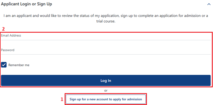 Create an account to navigate the SMS. Click on the Sign up for a new account to apply for admission button below.